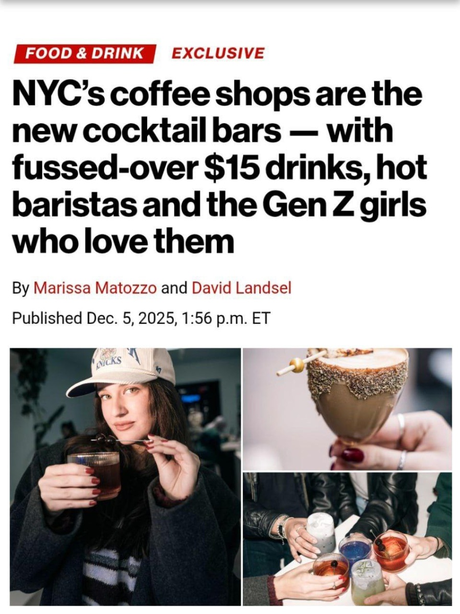 Алкогольные коктейли у зумеров официально умерли. Теперь тренд — дорогие кофе-коктейли по ₽2000–5000 за штуку, которые могут готовить сутки. Один из главных хитов — эспрессо + вишнёвый сок + чай, настоянные сутки на молоке, отфильтрованные и со льдом. Внешне похоже на Manhattan, но эффект как от Red Bull, а алкоголя 0. 65% зумеров в 2026 будут пить ещё меньше алкоголя, но атмосфера бара и красивая подача им всё ещё нужны.
