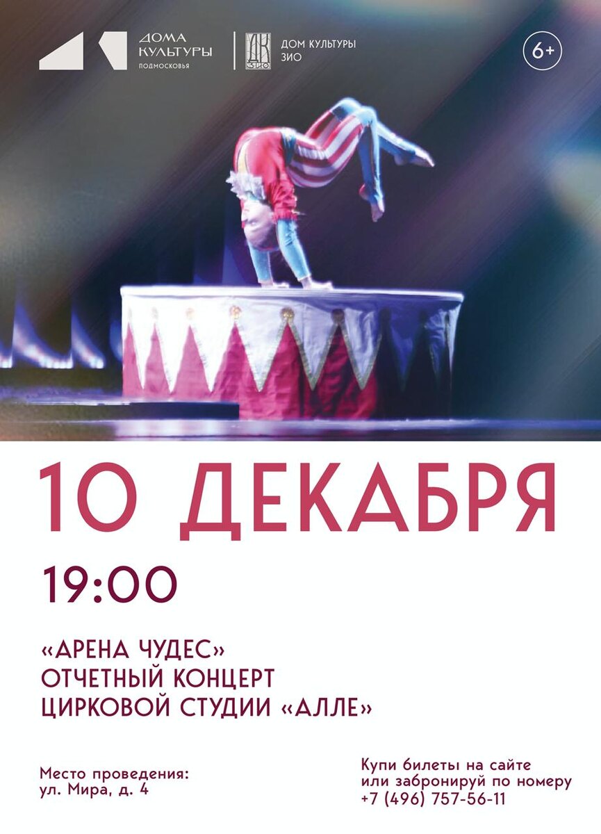 ✨ Отчетный концерт цирковой студии АЛЛЕ - Арена чудес 🤹💈В концертной программе будут представлены яркие, разножанровые номера юных цирковых артистов: ручной эквилибр, партерная и прыжковая акробатика, каучук, жонгляж, воздушное и партерное кольцо, полотна и другие. 🚫 Возраст: 6+ 📆 10.12.2025 🕒 19:00 🏢 ДК ЗИО 📍 г. Подольск, ул. Мира, 4 💰 Цена: 400 ₽ 🎫 Купить билет: https://arenachudes.ticketscloud.org/ #концертПодольск ⭐Поддержать канал голосом 🍰Где поесть в Подольске ✅ Мероприятия Подольск https://dzen.ru/id/66ed500f7b5671493eca3fd6 http://vk.com/podolsk_events http://dzen.ru/podolsk_events