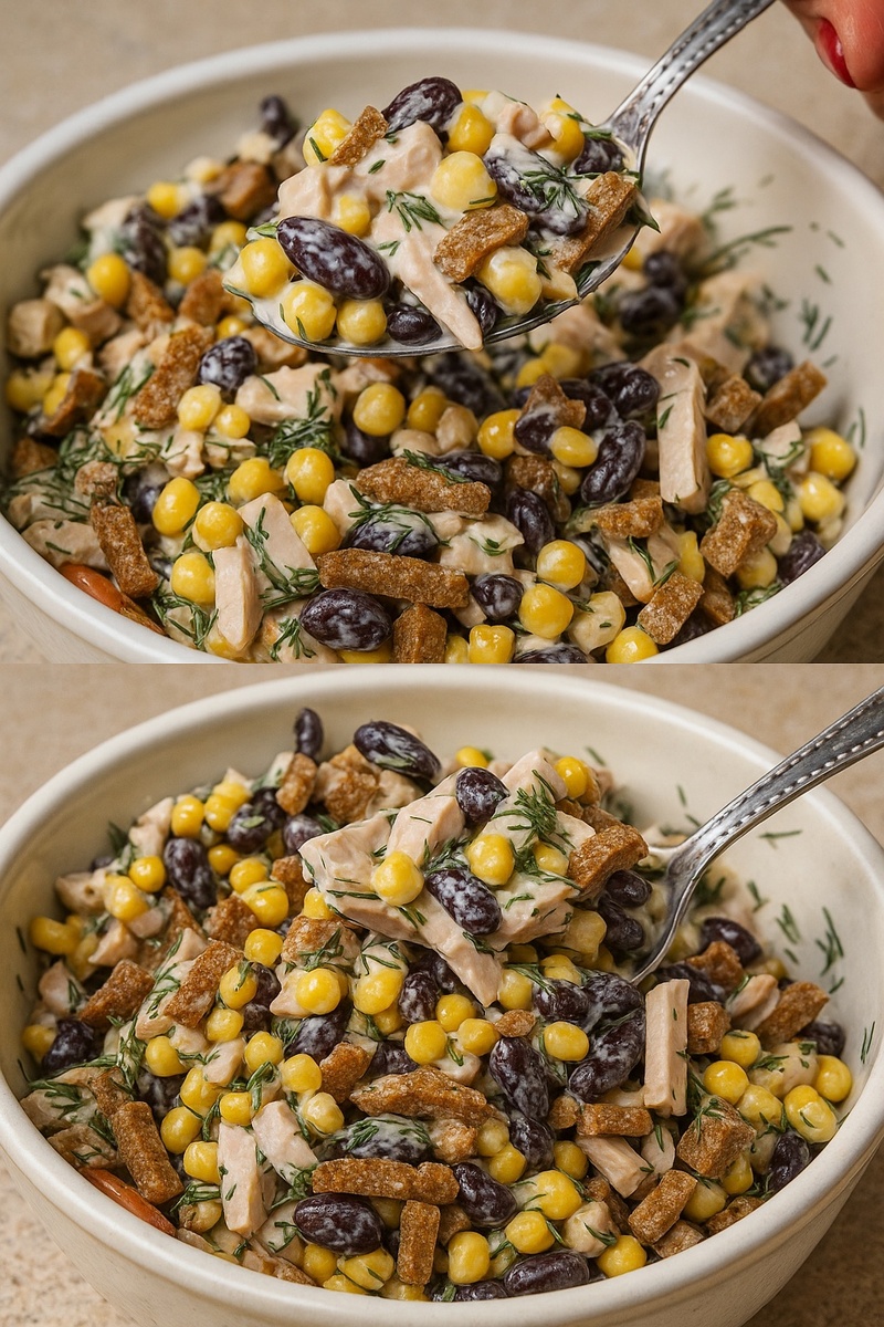 Простой, пикантный и очень сытный салат, который действительно исчезает со стола в мгновение. Отличное сочетание копчёной грудки, фасоли и хрустящих сухариков. Обязательно попробуйте — вкусно и быстро! ИНГРЕДИЕНТЫ: ✅ Красная фасоль — по вкусу ✅ Кукуруза — по вкусу ✅ Копчёная куриная грудка — по вкусу ✅ Сухарики (со вкусом шашлыка) — 2 пачки ✅ Майонез — для заправки ✅ Зелень — по вкусу ПРИГОТОВЛЕНИЕ: 1. Копчёную грудку нарезать небольшими кубиками 2. Фасоль и кукурузу откинуть на дуршлаг 3. Мелко порубить зелень 4. Смешать все ингредиенты, заправить майонезом 5. Перед подачей добавить сухарики и перемешать ПРИЯТНОГО АППЕТИТА!