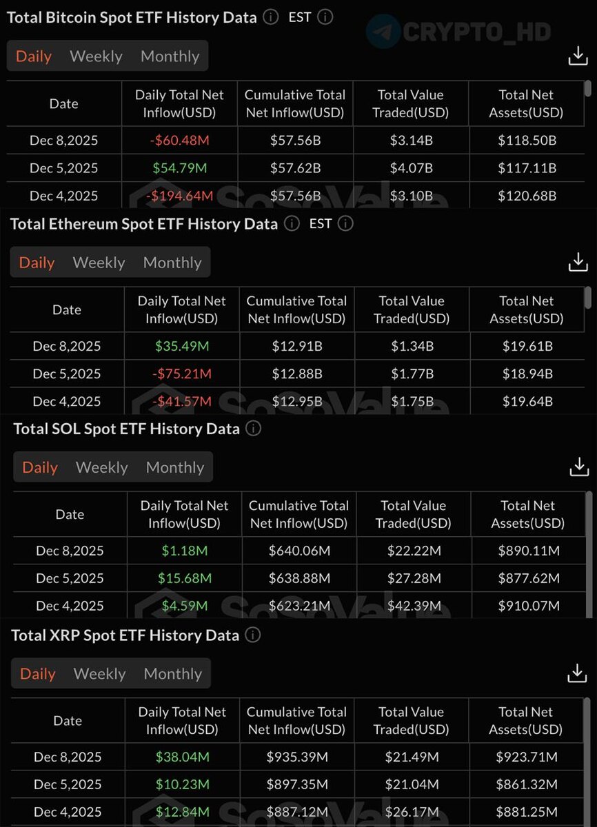 🤔 SV: Финпотоки крипто-ETF за вчерашний день. ▫️#BTC = -$60,480,000. ▫️#ETH = +$35,490,000. ▫️#SOL = +$1,180,000. ▫️#XRP = +$38,040,000 (16 зеленых дней подряд). ▫️#LINK, #DOGE, #HBAR, #LTC = нет данных или $0. Crypto Headlines