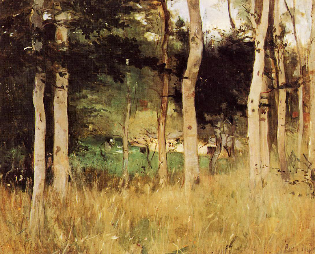 «Соломенный домик в Нормандии» – один из немногих чистых пейзажей, сохранившихся в творчестве французской художницы Берты Моризо (1841–1895). Полотно 1865 года, хранящееся сегодня в частной коллекции, является частью завещания Дени и Анни Руар 1993 года, включающего большую коллекцию работ Моризо. Коллекция была унаследована непосредственно от Берты Моризо, поскольку Дени Руар был её внуком. Хотя следующая картина названа в честь дома с соломенной крышей, именно десять берёз на переднем плане сразу же привлекают наше внимание в этой ранней работе. Эти почти вертикальные формы слегка изгибаются, придавая сцене более умиротворяющее настроение. Дом едва проглядывает сквозь листву и траву, как бы показывая зрителю, что человеческая жизнь подчинена окружающей природе. Трава изображена с поразительной реалистичностью, и кажется, что она переливается в лучах летнего солнца. Её отдельные пряди точно переданы с помощью простых изогнутых линий. Спокойствие сцены кажется мимолетным, словн