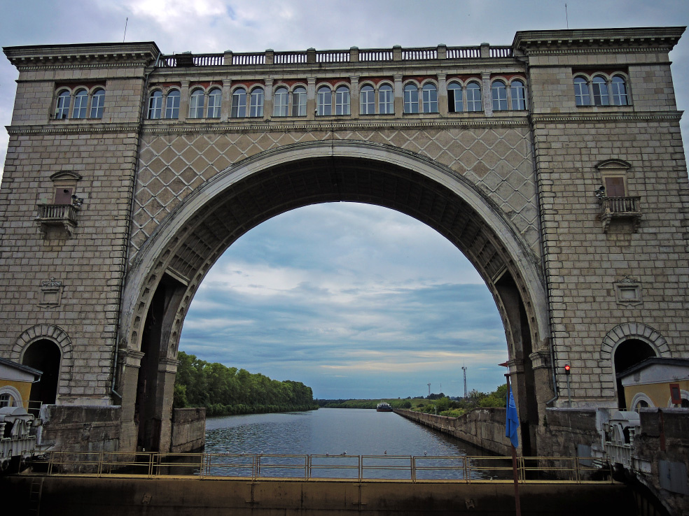 Продолжение рассказа о большом путешествии по Волге в июле 2015 года. Все материалы можно найти в подборке по ссылке в конце статьи. Подходит к концу третий день нашего круиза к верховьям Волги. Ярким его завершением стало прохождение шлюза Угличской ГЭС. Краткую справку об этом объекте я дал в предыдущей части, где описал заход в камеру шлюза. В новой подборке предлагаю продолжение фотоописания процесса шлюзования. Мы идём вверх, против течения реки, а значит, в шлюзе нас поднимают. После подъёма стала видна территория вокруг. Правда, лично моё внимание больше всего привлекает арка, расположенная в верхней части камеры. Шлюзование традиционно сопровождают чайки. Вместе с нами в камере ещё два судна. Наконец, камера заполнена, затвор перед нами опущен, начинаем движение. В предыдущей части уже упоминал, что прямо по центру арки хорошо заметна большая трещина. Как оказалось, она проходит насквозь. Позднее выяснил, что это предусмотренный температурный шов, снижающий наг