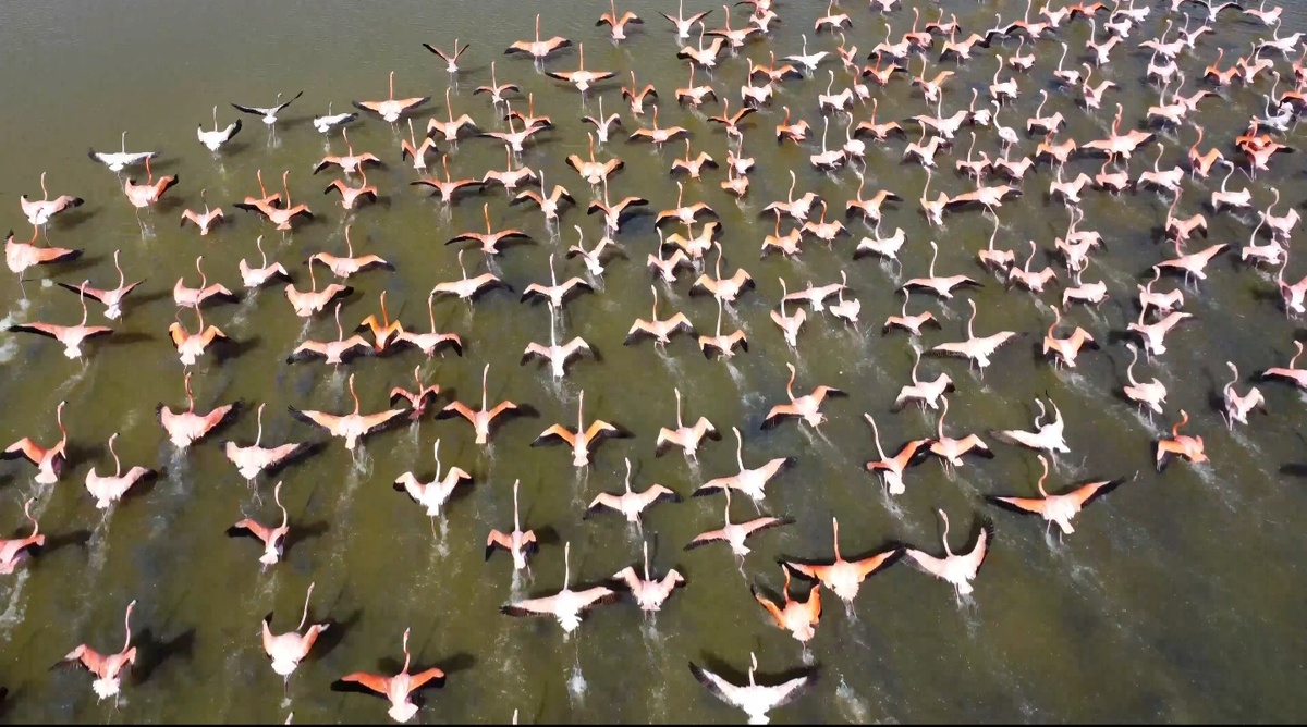 Мы даже подняли дрон - на кадрах фламинго выглядели как аккуратные розовые силуэты среди зелёных мангров.