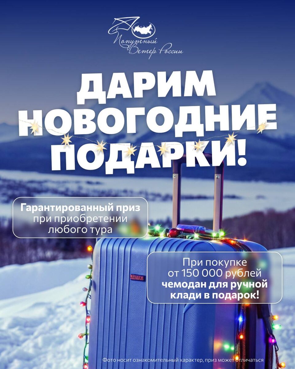 🎄Предновогодняя акция на все туры от «Попутного ветра России» Как же без традиционной раздачи подарков! В этом году вас ждут гарантированные призы при приобретении тура по любому направлению! А при покупке от 150 000 ₽ – вы получите стильный чемодан ручной клади в подарок! 🧳✈️ Акция действует пока не закончатся подарки! 🗓️ Подробности у менеджера: @wildtail_tour