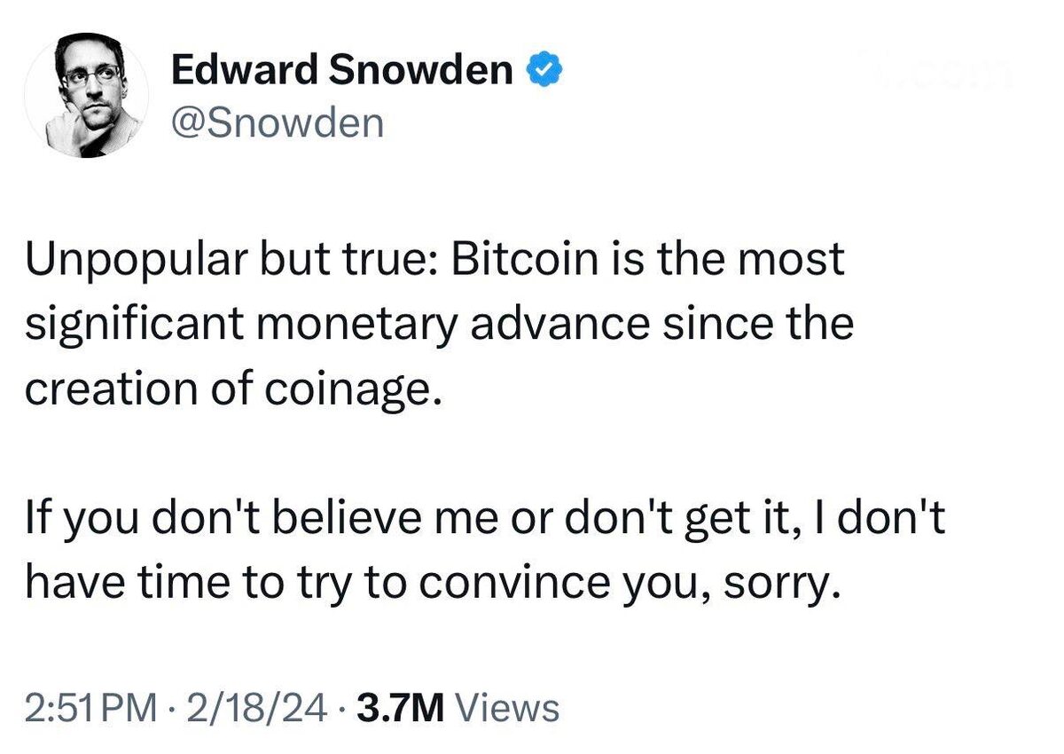 Биткойн — самый значимый денежный прорыв со времён чеканки монет Иногда рынок подбрасывает фразы, которые звучат как клинки. Не потому что они резкие — а потому что в них правда, от которой трудно увернуться. Эдвард Сноуден написал: «Bitcoin is the most significant monetary advance since the creation of coinage». И, знаете, инвесторы… недурно сказано. Даже слишком недурно. Меня всегда поражает, как легко люди отмахиваются от биткойна. Смотрят на цену, на хайп, на «волатильность» — и упускают главное: впервые за тысячу лет у человечества появился независимый, строго ограниченный, децентрализованный денежный протокол, который не контролирует ни банк, ни государство, ни корпорация. Это не очередной «финтех-стартап». Это новая форма денег. И когда такие вещи происходят, они обычно меняют саму структуру мира. Я наблюдаю за этим циклом, за тем, как деньги текут, как рынки путают и очищают — и всё больше понимаю: да, мы живём внутри той самой «монетарной революции», о которой потом буду