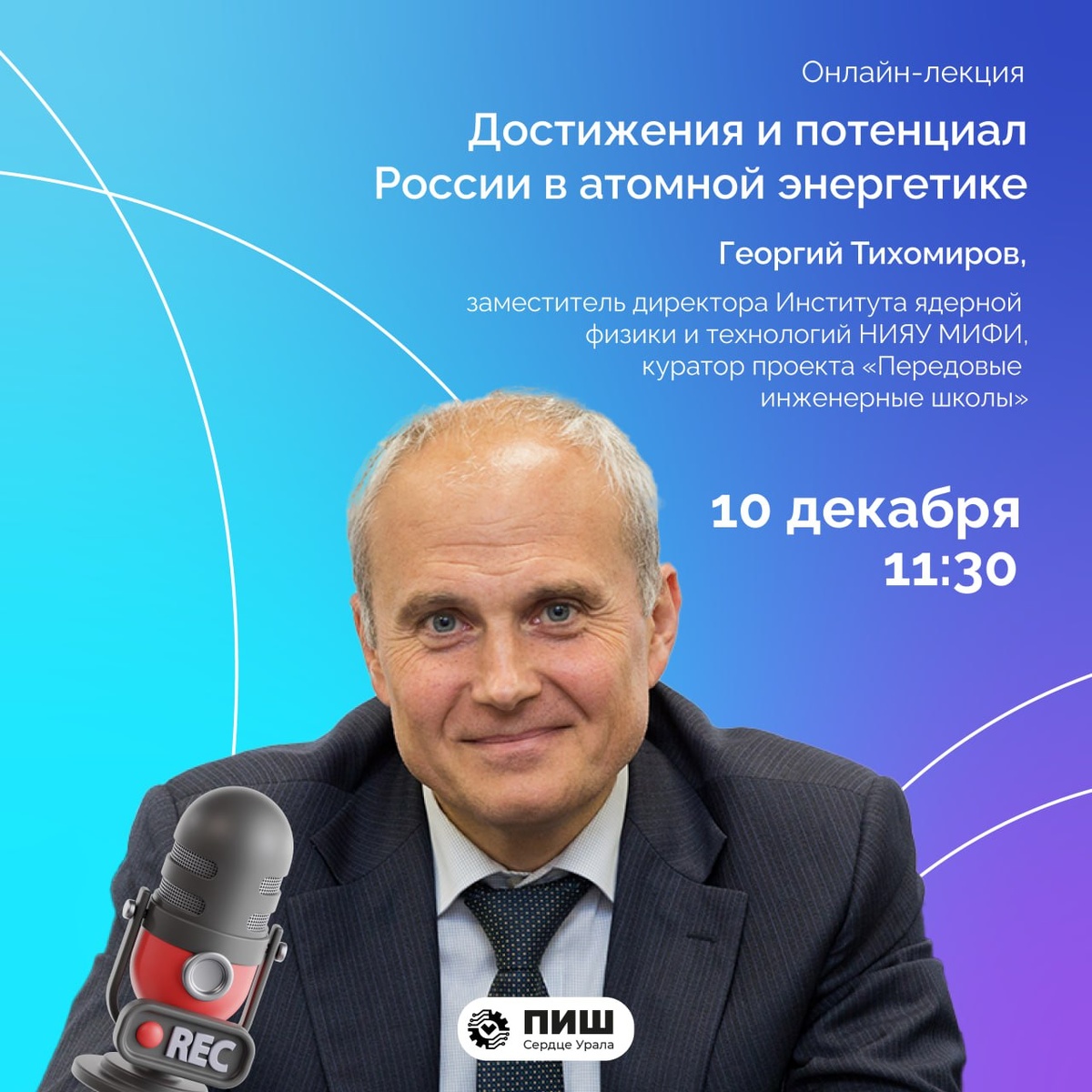 Уважаемые студенты ПИШ «Сердце Урала» ⚡️ Приглашаем вас на онлайн-лекцию, которая расширит ваш взгляд на энергетику будущего. ⏰ Дата и время: 10 декабря, 11:30 по Челябинскому времени 📌 Тема: «Достижения и потенциал России в атомной энергетике» 📣 Спикер: Георгий Тихомиров, заместитель директора Института ядерной физики и технологий НИЯУ МИФИ и куратор федерального проекта «Передовые инженерные школы». Присоединяйтесь к онлайн-лекции по ссылке. Лекция — это возможность: – Узнать о современных проектах и перспективных разработках в атомной отрасли. – Понять, как энергетика связана с транспортными и технологическими системами будущего. – Задать вопросы одному из ведущих экспертов в области ядерных технологий и инженерного образования. #ПИШ #ПИШСердцеУрала