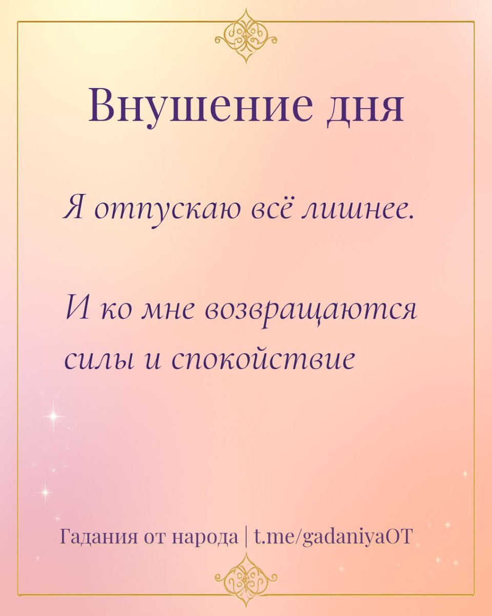Как пользоваться внушением дня Выберите удобный для себя момент — утром, днём или перед сном. Можно несколько раз в день, так как удобно вам. Прочитайте фразу медленно, один или несколько раз. Не нужно специально концентрироваться или ждать мгновенного эффекта. Просто позволяйте словам мягко звучать внутри и задавать настроение дня. Это маленький шаг в сторону очищения и облегчения — то, что так нужно в конце года. Каждый день — чуть-чуть, без спешки и без давления. Можно ставить на заставку или в качестве обоев, это усилит эффект.