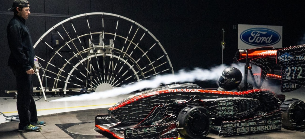 Шум и расчет акустических характеристик и аэродинамические трубы. Серия записей про аэродинамические трубы началась с записи испытаний команды ETS Montreal, где на заднем фоне можно было увидеть подозрительную полукруглую раму с какими-то датчиками. В комментариях её тоже заметили и предположили, что это что-то для аэроакустических измерений. И это так и есть! Вот несколько примеров. Это микрофонная решетка, которая нужна для определения источника шума. И ставят их не случайно именно в форме полукруга - это позволяет эффективно решать математические неопределенности при мат.обработке во время определения направления на источник шума. На 2-ой фотографии как раз идет поиск шума в аэродинамической трубе Ford - откуда и были фотографии в исходной записи. Видно, что все щели автомобиля заклеены. Это необходимо для изоляции конкретного элемента, для проверки его вклада в общую шумовую картину. И автомобиль находится на поворотной платформе, что бы проверять его при разном угле натекания ве