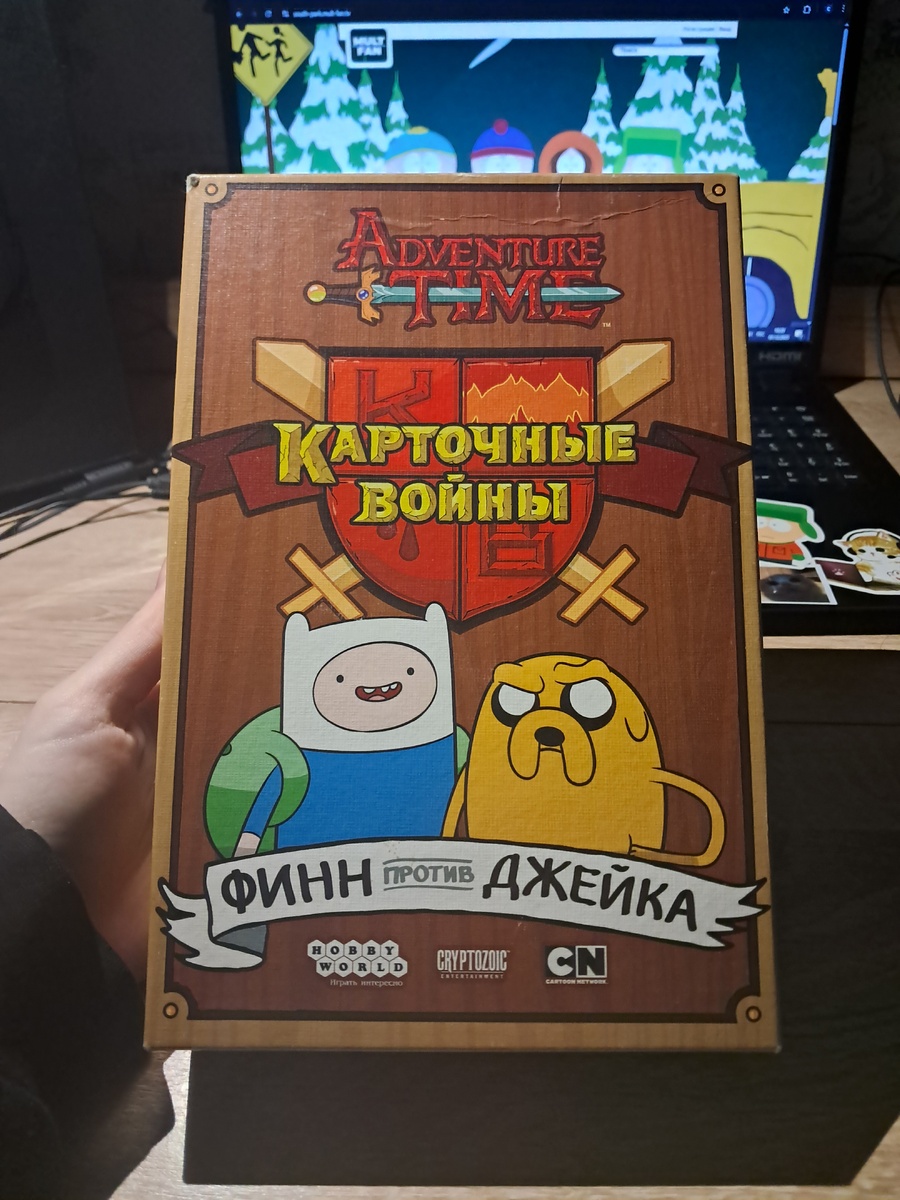 Всем привет! Сегодня Я вам расскажу про настольную игру «Карточные войны: Финн и Джейк». Покажу саму игру и покажу свои любимые карты. Сама игра предназначена только для двух игроков. Время одной партии в среднем выходит на 30 минут. На внешнем виде коробки не будем заострять внимание, самое интересное внутри!! А внутри нас ждут по 4 планшета разных земель. В нашем случае, это Кукурузные поля и Синюшные поля (когда вы будете читать в инструкции про сам геймплей, то про планшеты земель будет говорится «Поля». Поэтому 1 планшет = 1 поле) Наши жизни и урон. Рамочки для планшетов земель и жизней игрока. Карты для каждого типа земель (вы поймёте какая колода принадлежит какой земле, так как у каждого типа земель есть свои существа) Ну и сама инструкция к игре. А теперь пройдётся по колодам. В каждой колоде есть Существа, Строения и Заклинания. Они все могут быть связаны с каким-то типом земель, а могут быть «Радужными». Это значит, что такие карты могут находиться в любой колоде