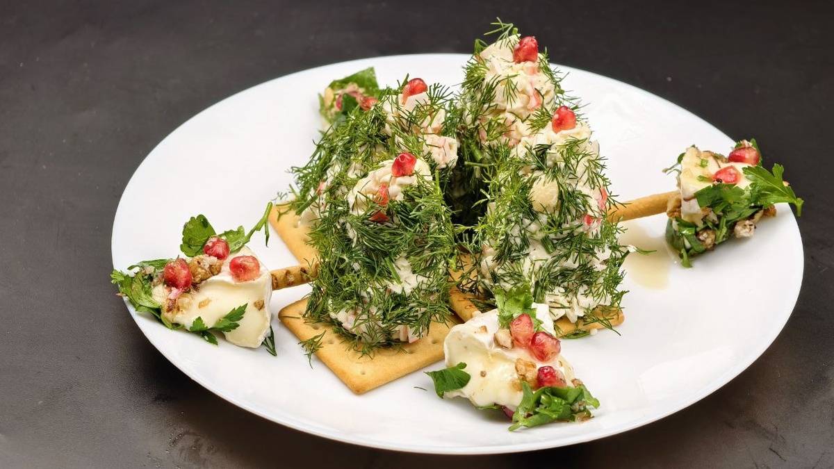 3.Формируем. Берем крекер. Желательно круглой формы, но я нашла квадратные. Формируем из массы с крабовыми палочками овалоподобные длинные елочки. Обваливаем в резанном укропе и вместо звезды украшаем