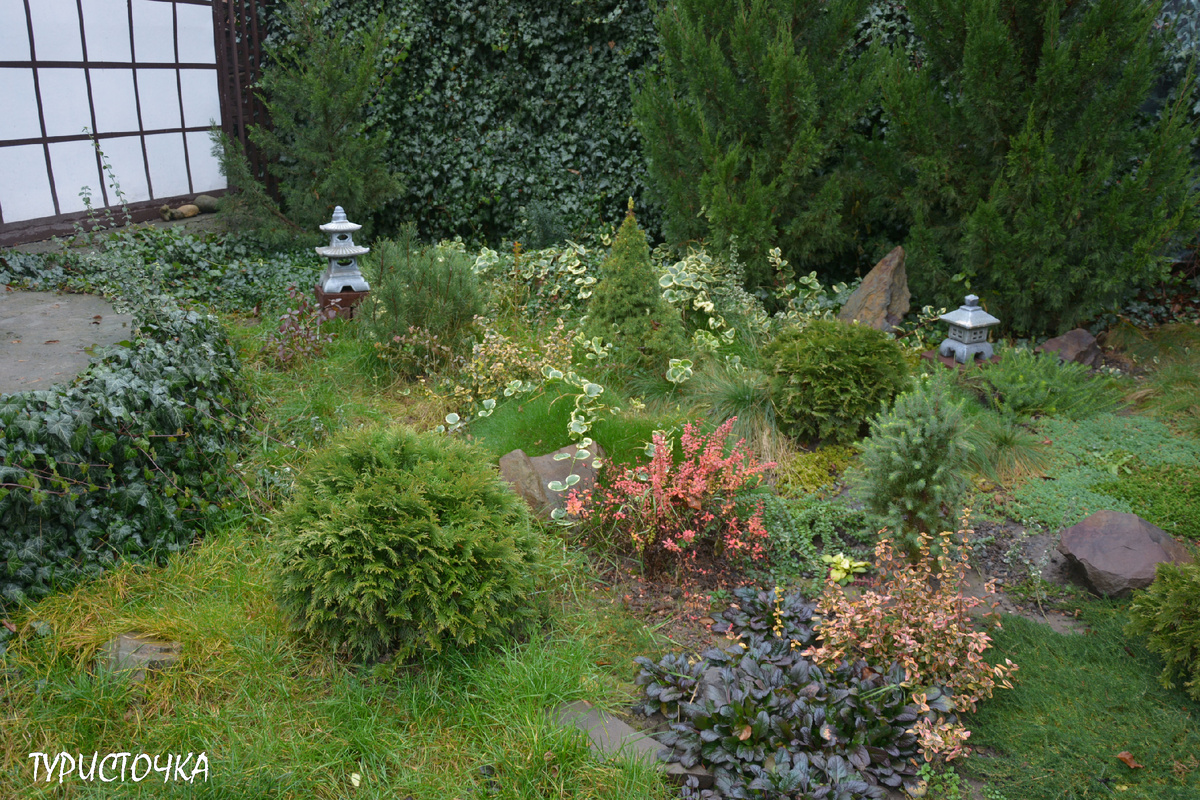 Задний фон - можжевельники различных сортов. Правее вейгелы - тис, далее фотиния, ещё правее, возле японского домика) - лавровишня Отто Люкен, ещё один тис Хикси, правее него — рододендрон катевбинский Grandiflorum.