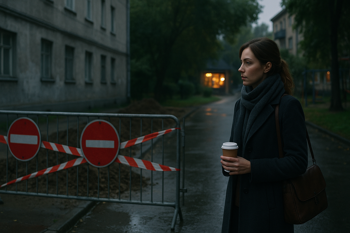 Прямо поперёк тротуара стоял металлический забор с ярко-оранжевыми лентами. За ним — вскрытый асфальт, груды песка и два рабочих в оранжевых жилетах, лениво опирающихся на лопаты. Табличка сообщала: «Ремонтные работы. Проход закрыт».