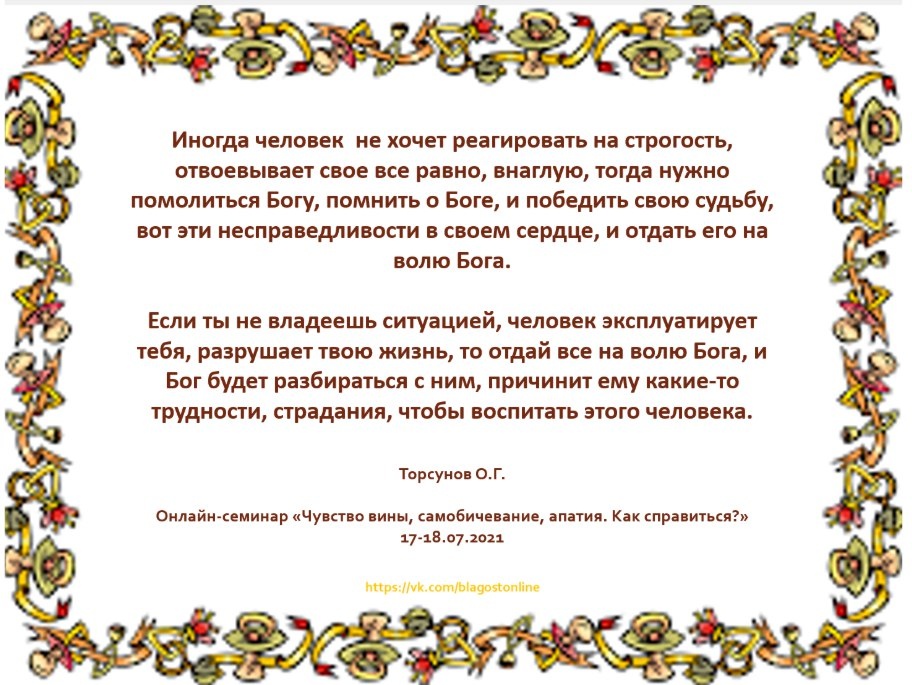 Иногда человек не хочет реагировать на строгость, отвоевывает свое все равно, внаглую, тогда нужно помолиться Богу, помнить о Боге, и победить свою судьбу, вот эти несправедливости в своем сердце, и отдать его на волю Бога. Если ты не владеешь ситуацией, человек эксплуатирует тебя, разрушает твою жизнь, то отдай все на волю Бога, и Бог будет разбираться с ним, причинит ему какие-то трудности, страдания, чтобы воспитать этого человека.