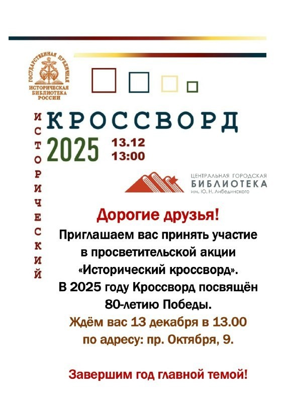13 декабря в 13:00 пройдёт просветительская акция «Исторический кроссворд». 🔥 Приглашаем всех желающих в библиотеку им. Либединского принять участие и проверить свои знания о ключевых событиях и героях Великой Отечественной войны. Узнать что-то новое и почтить память тех, кто сражался за нашу Родину. ----- Сообщает: Администрация города Миасса 🫛Миасс Православный