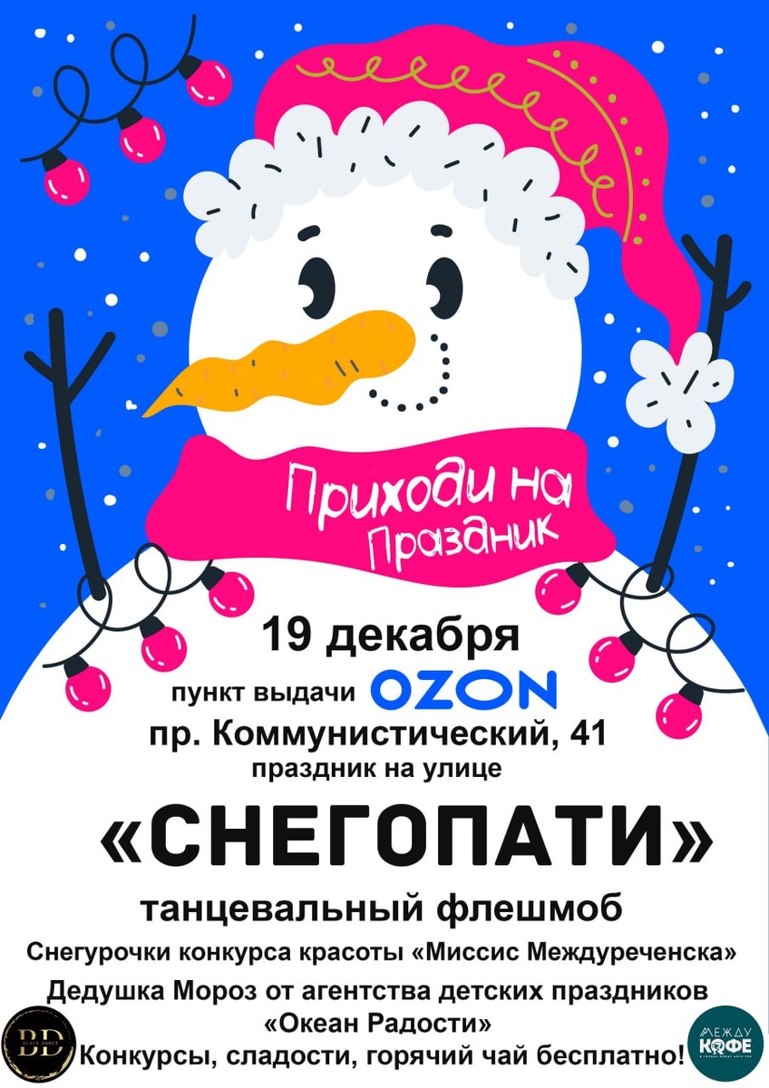 Мы превращаем пункт выдачи OZON на Коммунистическом, 41 в главную точку притяжения зимнего настроения! 👇👇👇 📅 19 декабря 📍 OZON, пр. Коммунистический, 41 (на улице!) 🎁 Всё бесплатно! ЧТО БУДЕТ: ➡️ Танцевальный флешмоб «СНЕГОПАТИ» ➡️ Снегурочки и Дед Мороз ➡️ Конкурсы и сладости ➡️ Горячий чай Встречаемся точка на карте 👉 пр. Коммунистический, 41 (у пункта выдачи OZON) ❄️Начало в 18-00 #ПраздникВМеждуреченске #OZON