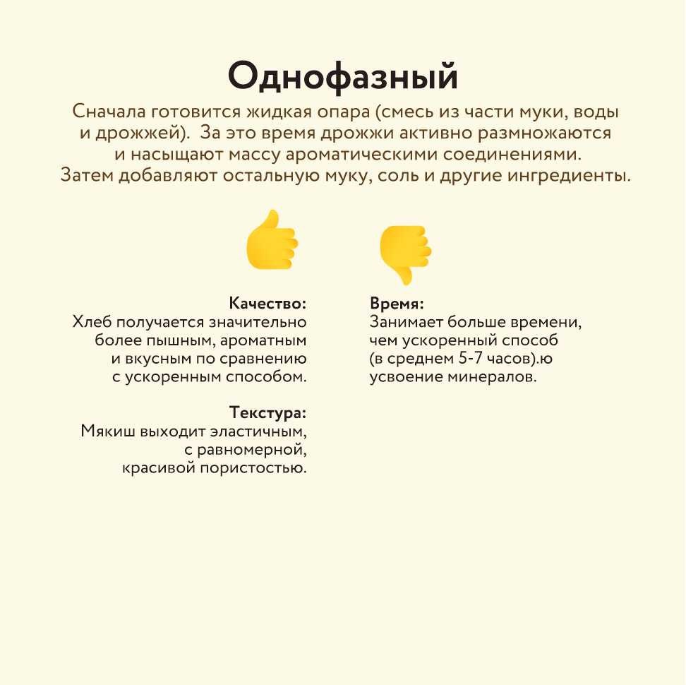 Сначала готовится жидкая опара (смесь из части муки, воды и дрожжей), которая бродит 2-4 часа. За это время дрожжи активно размножаются и насыщают массу ароматическими соединениями. Затем в готовую опару добавляют остальную муку, соль и другие ингредиенты. Плюсы: Качество: Хлеб получается значительно более пышным, ароматным и вкусным по сравнению с ускоренным способом. Текстура: Мякиш выходит эластичным, с равномерной, красивой пористостью. Минусы: Время: Занимает больше времени, чем ускоренный способ (в среднем 5-7 часов).