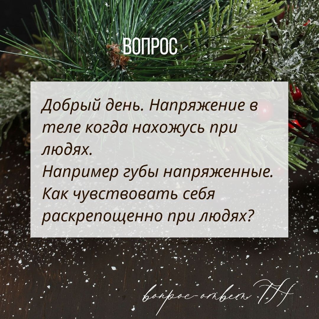 Поверьте, вы точно не одна испытываете напряжение. Но важно отследить: а прям везде? И в магазине? И в мед центрах? И с друзьями? Подумайте, есть ли люди, с которыми вам комфортно. Это важно и если они есть , то тревожность и напряжение снизится. Тело как сигнал. Показывает, что небезопасно. Вы отследили напряжение губ, можно усилием воли/мысли улыбнуться, хотя бы попробовать, поддерживать себя (дыхание, отвлекающие мысли, поиск глаз человека, которого знаете и вам безопасно) Вероятно, были неприятные ситуации, где вы чувствовали себя неловко, вот так организм вспоминает. Например, знаменитые стихи на детских елках подходят далеко не всем детям! И дети несут потом этот стресс спустя года. Также 🟢🟢🟢🟢🟢 исключить тревожное расстройство 🙏 здесь врачи придут на помощь. Как же чувствовать себя раскрепощенно? 🍃Определиться, везде ли, со всеми ли, всегда ли? 🍃Настроится : дыхание, танцы или любые движения до важного мероприятия. Много рекомендаций в свободном доступе, не буд