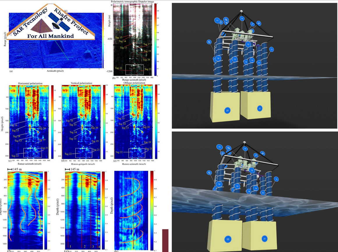 Проект Khafre — это амбициозная инициатива по применению космических технологий для изучения древнеегипетских пирамид. Названный в честь фараона Хафры (строителя второй пирамиды в Гизе), он стремится «для всего человечества» раскрыть скрытые структуры под этими монументами. Команда, возглавляемая итальянским профессором Филиппо Бионди из Университета Пармы, использует данные спутников SAR для создания трёхмерных томографических изображений. Недавние публикации, включая изображения горизонтальной и вертикальной поляризации, а также 3D-модели, показывают аномалии под пирамидой Хафры: спиралевидные туннели, камеры и даже возможные вертикальные шахты, уходящие на глубину до 145 метров и более.