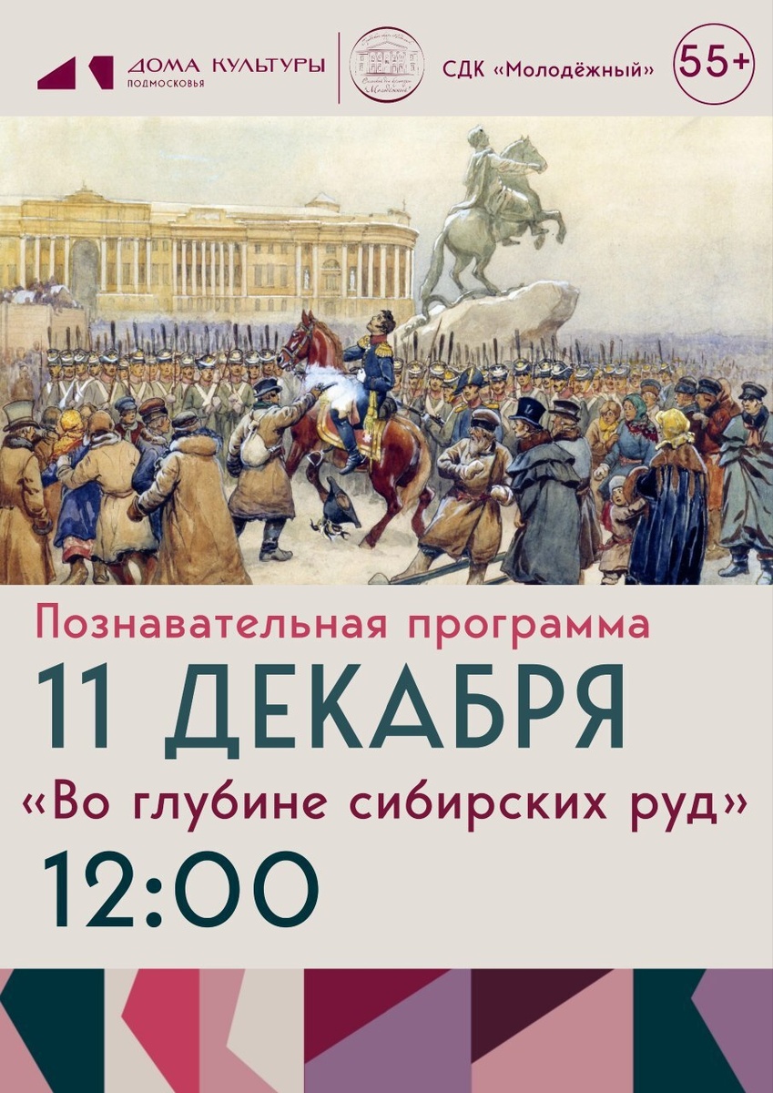 ✨ Познавательная программа о декабристском восстании ❗Вспомним наиболее известных представителей декабристского движения, познакомимся с их жизнью и деятельностью. Многие из декабристов были близкими друзьями А.С. Пушкина. 💥11 жён декабристов разделили со своими мужьями изгнание в Сибири. В нашей программе вы узнаете, как сложилась их судьба. 🚫 Возраст: 55+ 📆 11.12.2025 🕒 12:00 🏢 СДК «Молодежный» 📍 г.о. Подольск, пос. Молодёжный, д.30 💰 Вход свободный❗️ ⭐Поддержать канал голосом 🍰Где поесть в Подольске ✅ Мероприятия Подольск https://dzen.ru/id/66ed500f7b5671493eca3fd6 http://vk.com/podolsk_events http://dzen.ru/podolsk_events