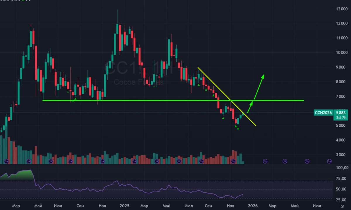 ☕️ Какао 🟢 В прошлом посте показывал локальную ПГИП - идем ее отрабатывать. А сейчас предлагаю посмотреть ситуацию на днеках. Так как на моекс график короткий. то беру какао-фьючерс американский. Динамика схожая. 🟢 В данный момент пробиваем желтую нисходящую наклонку и двигаемся к сильному сопротивлению. Отметил его горизонтальной зеленой линией. Если мы и его пробьем в будущем, то рост продолжится на высоту всей проторговки, которая находится под линией сопротивления. 🚗 Жду рост какао в декабре, но сначала отработку ПГИП #какао #cc1 #cocoa #bogdanoffinvest $CCH6