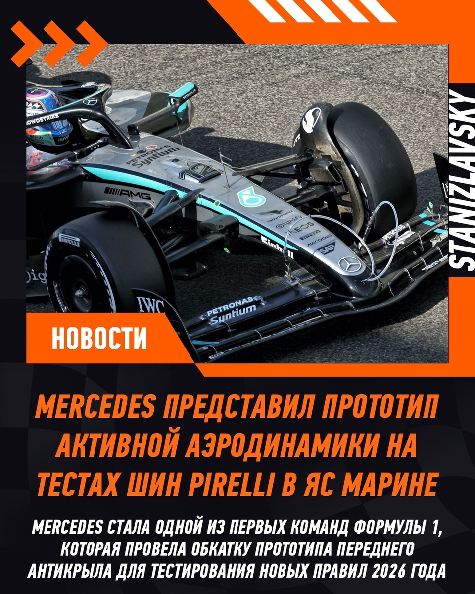 Во вторник на трассе Яс Марина все 10 команд Формулы 1 участвуют в тестах шин Pirelli 2026 года. Эти испытания проходят с использованием так называемых «мул-каров» — машин 2025 года, модифицированных под уровень прижимной силы, который будет применяться в 2026. Команды едут с пониженной прижимной силой, сравнимой с той, что используется на Гран-при Италии, и с изменёнными колёсамм. Для точного моделирования новых условий FIA разрешила применять прототипные передние крылья. Это важно, потому что с 2026 года в Формуле 1 дебютирует активная аэродинамика, которая придет на смену системе DRS. 🏁 DRS используется в Ф1 с 2011 года и помогает гонщикам обгонять, снижая сопротивление заднего крыла на прямых. В 2026 году её заменит активная аэродинамика — передние и задние крылья будут автоматически изменять положение на прямых участках трассы, открываясь для уменьшения сопротивления. Особое внимание в первый день тестов в Абу-Даби привлёк Mercedes. Его переднее антикрыло выглядело необычно: кон
