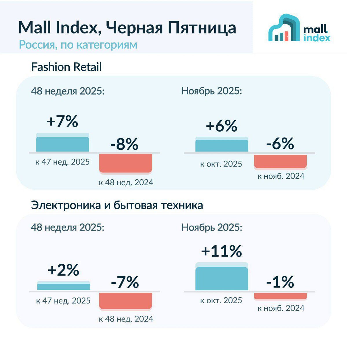 🖤Mall Index, итоги Черной Пятницы Данные по России по категориям 👚Fashion Retail: За 48 неделю 2025 +7% к 47 неделе 2025 -8% к 48 неделе 2024 За ноябрь 2025 +6% к октябрю 2025 -6% к ноябрю 2024 💻Электроника и быт. техника: За 48 неделю 2025 +2% к 47 неделе 2025 -7% к 48 неделе 2024 За ноябрь 2025 +11% к октябрю 2025 -1% к ноябрю 2024 «Отдельным ритейлерам на 48 неделе удалось “собрать” существенную часть аудитории на фоне общего снижения, хотя отставание год-к-году осталось», – Михаил Васильев, Focus Technologies.
