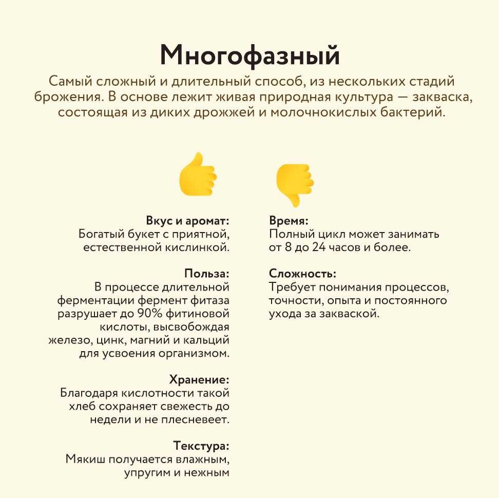 Это самый сложный и длительный способ, использующий несколько стадий брожения (обновление закваски -> приготовление опары -> замес теста). В основе лежит не промышленные дрожжи, а живая природная культура — закваска, состоящая из диких дрожжей и молочнокислых бактерий. Плюсы: Вкус и аромат: Богатейший, сложный букет с приятной, естественной кислинкой. Такой вкус невозможно воспроизвести с помощью улучшителей. Польза: Молочнокислые бактерии создают кислую среду, которая подавляет развитие плесени и патогенных микроорганизмов. В процессе длительной ферментации фермент фитаза успевает разрушить до 90% и более фитиновой кислоты, высвобождая железо, цинк, магний и кальций для усвоения организмом. Заквасочный хлеб — это натуральный пребиотик, способствующий здоровью микрофлоры кишечника. Хранение: Благодаря кислотности такой хлеб сохраняет свежесть до недели и не плесневеет. Текстура: Мякиш получается влажным, упругим и нежным. Минусы: Время: Полный цикл может занимать от 8 до 24 часов и бо