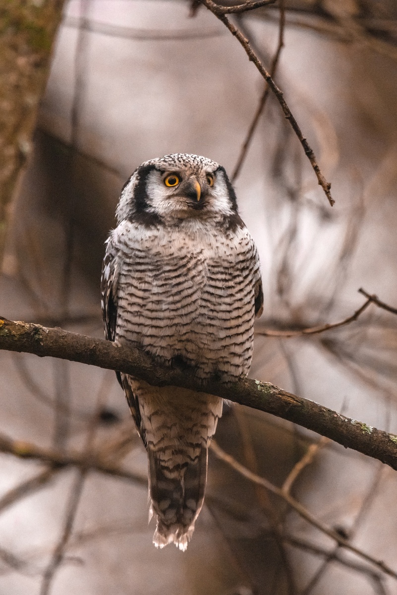 Зимой птичий хор Петербурга стихает, но это не значит, что в небе и парках никого не осталось. Напротив, в это время можно встретить редких и неожиданных гостей. Один из них — стремительный хищник, которого по полету и повадкам легко принять за ястреба. Это ястребиная сова, и сейчас она гостит в одном из городских парков. Рассказывает Катя Стрельникова: — Ястребиная сова — одна из самых нетипичных и северных сов: по полету и манерам она больше похожа на ястреба, чем на классическую ночную хищницу. Это птица среднего размера, длиной около 35–40 см, с размахом крыльев до 80 см. Ее стремительный силуэт определяется длинным хвостом. Своеобразная «тельняшка» из перышек на груди тоже напоминает окрас ястребов. В отличие от большинства сов ястребиная сова активно охотится днем. Она подолгу сидит на вершинах деревьев, а затем стремительно слетает вниз за добычей. Такой метод позволяет ей охотиться даже на белок и рябчиков. Основу ее рациона составляют мышевидные грызуны: непосредственно
