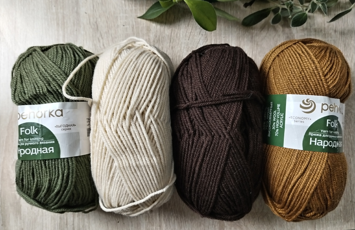Я сразу решила, что это будет не меринос. При всей его приятности и нежности, у него есть пара-тройка недостатков: легкая растяжимость, не такой уж и теплый и цена (400-500 рублей за 50 граммовый моточек). Вы можете возразить, что можно купить бобинный меринос и он выйдет более бюджетно. Но я его вообще не рассматривала. Вспомнив свой опыт работы с Семеновской пряжей, решила поэкспериментировать с какой-нибудь отечественной смесовкой. Перебрав пол-интернета, я остановилась на неожиданном варианте — «Народной» пряже от Пехорки. Да, состав не ахти: 30% шерсть, 70% высокообъемный акрил. Знатоки скривились бы. Но меня подкупили: