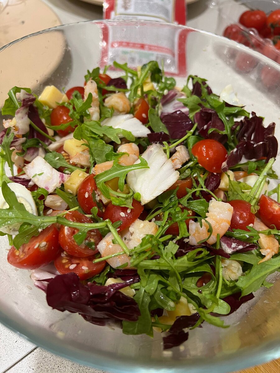 Вкуснейший салат из интересных ингредиентов за 5 минут. Иногда мы представляем салат как что-то простое, почти скучное, но на самом деле достаточно сочетать несколько ярких продуктов, и получается совершенно иной вкус. А гости думают, что такой салат готовят только в ресторане, хотя я его приготовила всего за 5 минут дома! Давайте готовить вместе! Чтобы не пропускать новые рецепты и всегда быть в курсе самых аппетитных «обновлений», обязательно подписывайтесь на канал и включайте уведомления. Итак, для нашего салата понадобятся: креветки, свежий салат в горшочке, перепелиные яйца, помидоры черри, твёрдый сыр, соль и любая заправка, которая нравится именно вам. И что особенно приятно, количество каждого ингредиента зависит только от ваших желаний. Хотите больше креветок? Смело добавляйте! Любите, когда салат более свежий и лёгкий, увеличьте количество «зелени». В этом рецепте нет строгих рамок, и именно это делает его таким универсальным. Шаг первый. Ставим вариться креветки. Немного