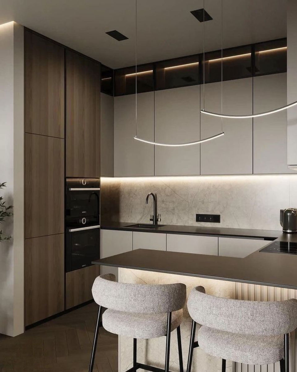 Сильные стороны, о которых говорят все: Абсолютный максимум рабочих поверхностей и storage. Все, что нужно, - в одном шагу. Идеальная эргономика. Зоны выстраиваются логично, без лишних движений. Четкое зонирование. Остров отделяет кухонную «грязную» зону от чистой - столовой или гостиной. Вместительность и статусность. Визуально это решение говорит о просторе и продуманном дизайне. Главные преимущества, о которых молчат: Остров как «социальный магнит». Он останавливает гостей в правильном месте, не пуская их в сам рабочий периметр, но вовлекая в общение. Контроль над пространством. Стоя у острова, вы видите и кухню, и гостиную, чувствуя себя хозяином положения. Многосветность. У вас появляется 2 фронта освещения: окна вдоль одной из сторон «П» и светильники над островом. Это убивает главный