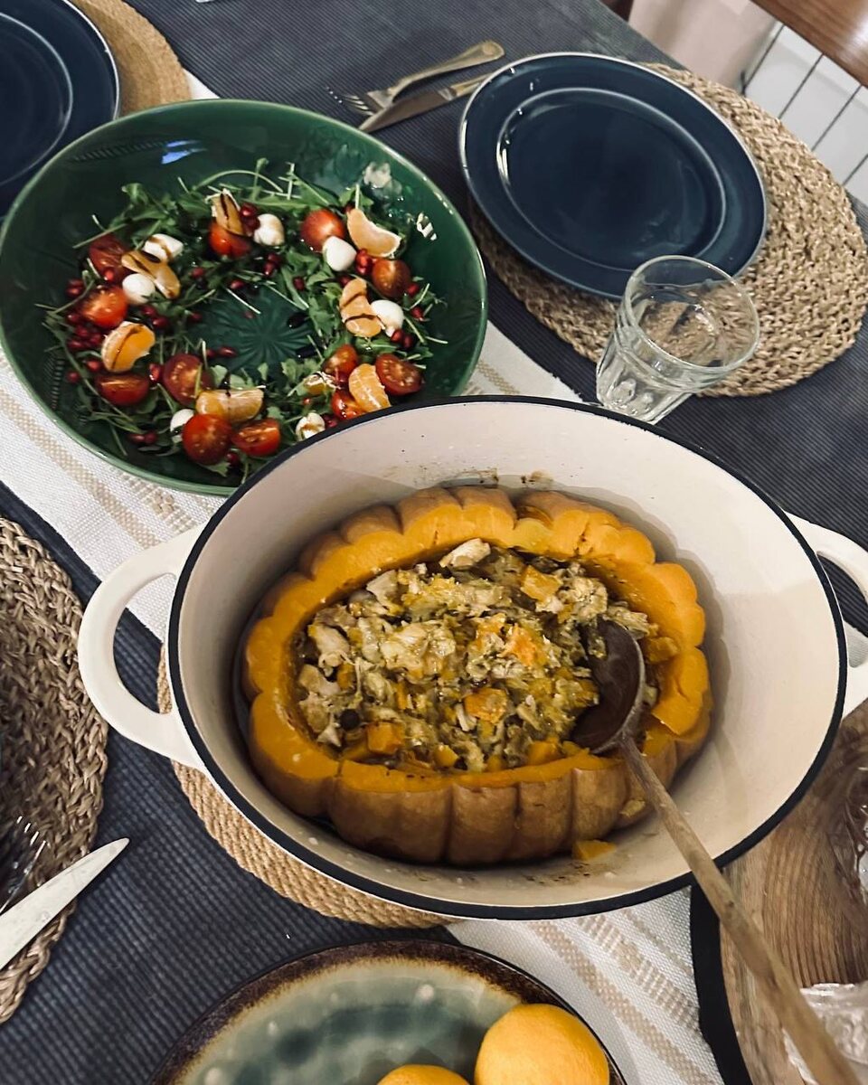 ✔️ Тыква осенняя домашняя. Разрезала пополам, вынула сердцевину. Внутрь кусочки куриного бедра, томленный на сливочном масле лук и чеснок, немного сливок, кусочки тыквы, немного изюма. Специи: зира, чили, куркума, кориандр, черный перец. На дно стакан воды и в духовку. Пусть томится под крышкой в чугунной кастрюле 2 часа при 160 градусах.