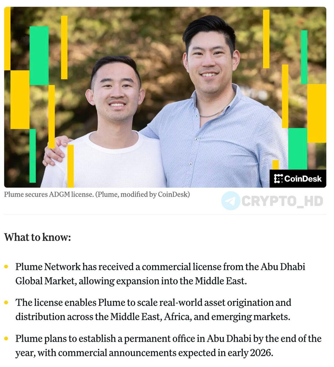 🇦🇪 #PLUME Plume Network разрешили работать с институционалами в ОАЭ. Регулятор ADGM выдал проекту коммерческую лицензию для работы с RWA (токенизированными активами). Команда Plume Network собирается открыть постоянный офис в Абу-Даби к концу года. Crypto Headlines