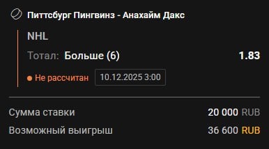 🏒🏒🏒🏒🏒 🐧Питтсбург - 🦆Анахайм Анахайм в огне - 3.7 шайб в среднем за игру, больше "Уток" во всей лиге забрасывает только Колорадо, но проблема в том, что травмировались сразу оба ключевых вратаря, поэтому в раме стоит максимально нестабильный Хуссо, своё он пропустит точно. Гостям нет смысла отсиживаться в обороне с таким вратарём, поэтому жду открытую игру, Питтсбург также не прочь зарубиться на встречных курсах при Мьюзе, да и вообще "Пингвины" сейчас в атаке более чем. Прогноз: Тотал больше 6