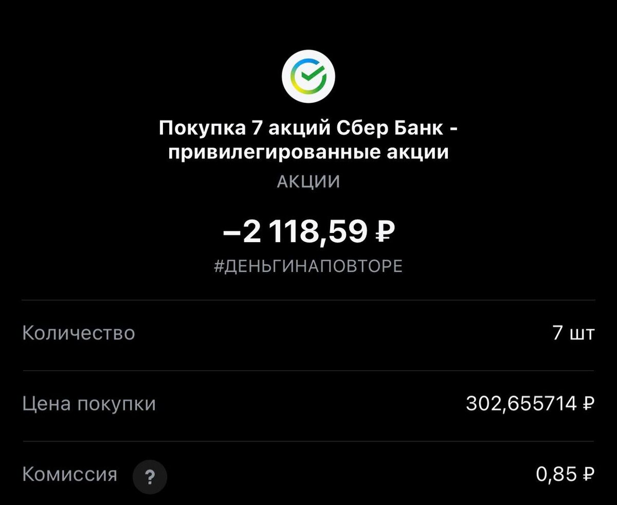 Коллеги, всем привет! Покупка на сегодня в стратегию #деньгинаповторе с учетом денег с полученных купонов по ОФЗ и оставшихся денег с прошлых сделок. Статистика портфеля на стороннем сервисе, можно посмотреть по "ссылке" 🔗 Все сделки и пополнения ссылка 🟢 ПОКУПКА Эмитент: "Сбер Банк ап" Тикер: #SBERP Цена покупки: 302.65 rub 7 лотов 🔗 чат для общения "тут" ✈️ Стас Мироненко 📹Youtube | 📹Rutube