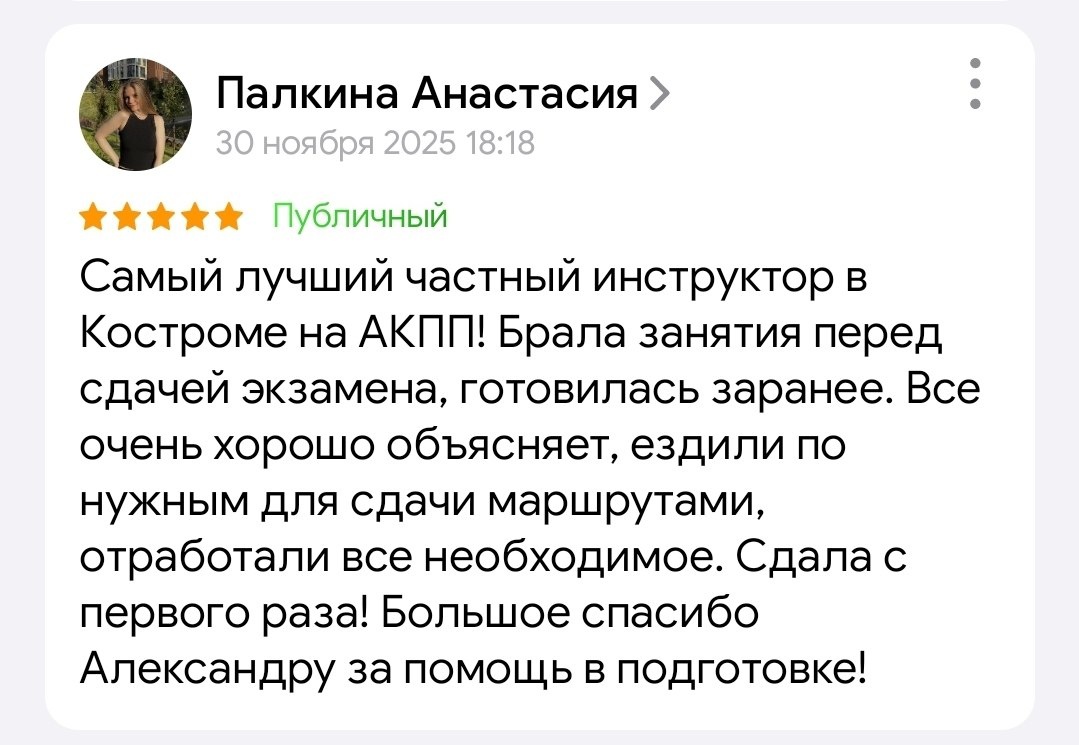 Анастасия, спасибо за такой мощный отзыв! Сдача экзамена с первого раза — это лучший показатель нашей совместной работы и Вашего усердия 🏆. Ваш пример отлично доказывает: когда мы детально разбираем экзаменационные маршруты и «шлифуем» каждый маневр на АКПП, результат гарантирован. Вы большая молодец, схватывали всё на лету! Удачи Вам на дорогах, ни гвоздя, ни жезла 🚗💨. А для тех, кто хочет повторить успех Анастасии и уверенно сдать экзамен, запись на вождение открыта по ссылке: https://dikidi.net/1829681