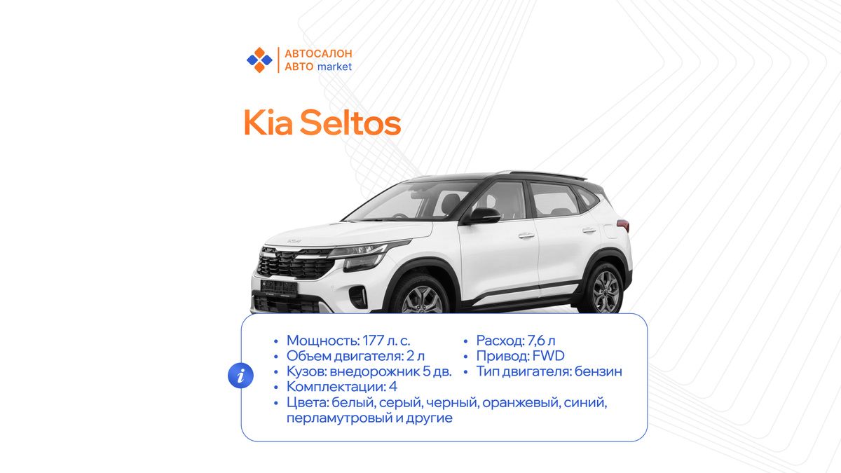 Kia Seltos — это автомобиль, который подходит как для поездок по городу, так и для дальних путешествий с семьей. Он сочетает в себе стильный внешний вид, высокую проходимость и отличную экономичность.