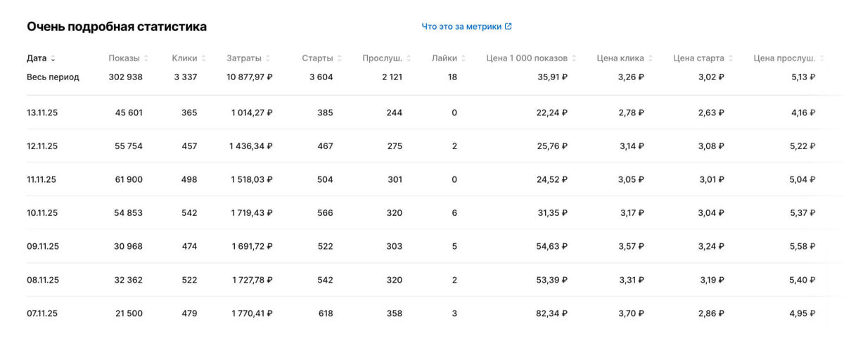 Хочу поделиться свежими цифрами, потому что вопрос «сколько стоит слушатель в Импульсе от Яндекса?» мне задают едва ли не каждый день. На скрине - результаты кампании Импульса по треку в жанре рок на взрослую аудиторию (30+). Бюджет - 10 877 ₽. Что получилось по факту: За весь период: 302 938 показов 3 337 кликов 3 604 стартов трека 2 121 прослушивание Цена за прослушивание 5,13 рублей (колебалась от 4,16 рубля до 5,58 рублей в разные дни) Что важно понимать: Импульс приводит максимально «чистый» трафик - людей, которые уже внутри Яндекса и слушают музыку. Для взрослой аудитории в рок-жанре стоимость 4–5 рублей за прослушивание - реалистичная, нормальная цифра. Если вы думаете пробовать Импульс - ориентируйтесь именно на такой диапазон. Он помогает адекватно планировать бюджет и не ждать магии.