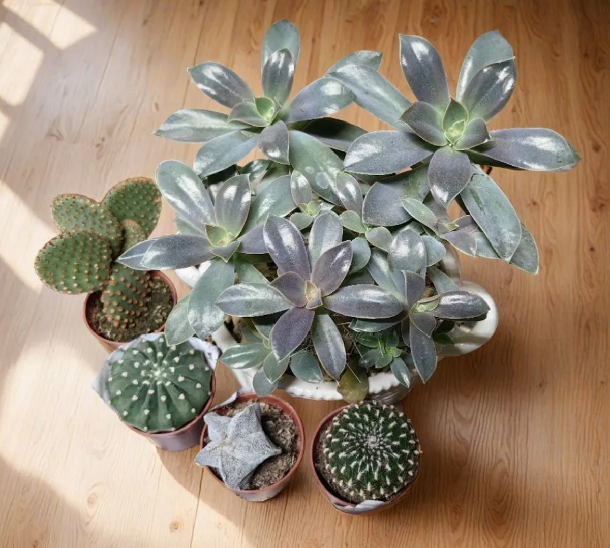 Наконец-то у меня дошли руки пересадить мои новокупленные кактусята. Их скопилось уже четыре штуки и всех их я задумала посадить в бульонницу из Фикспрайса. Но в ней уже растет Граптоверия Фред Айвс, которую я как раз таки хотела пересадить в горшок побольше, а то уж больно основательно она выросла. Так что у нас вновь круговая миниатюрная пересадка)) Посидел в горшке, передай другому))) Вот эти кактусята ждут у меня особенно долго, Опунция к ним недавно сравнительно присоединилась. Серебристый кактусеныш как-то нехорошо кренится на бок, там похоже что-то с корнями. Кстати, Граптоверия Фред Айвс последний раз была пересажена в конце июля и выглядела вот так. На дне бульонницы еще слой керамзита, так что земли там не так чтобы много на весь этот объем. Но на тот момент ей хватало. А сегодня, в начале декабря это уже вот такие вот заросли. Я купила этот суккулент именно потому, что из него можно вырастить очень заметный крупняк. Пока что это удается сделать. Из крохотных малышей уже