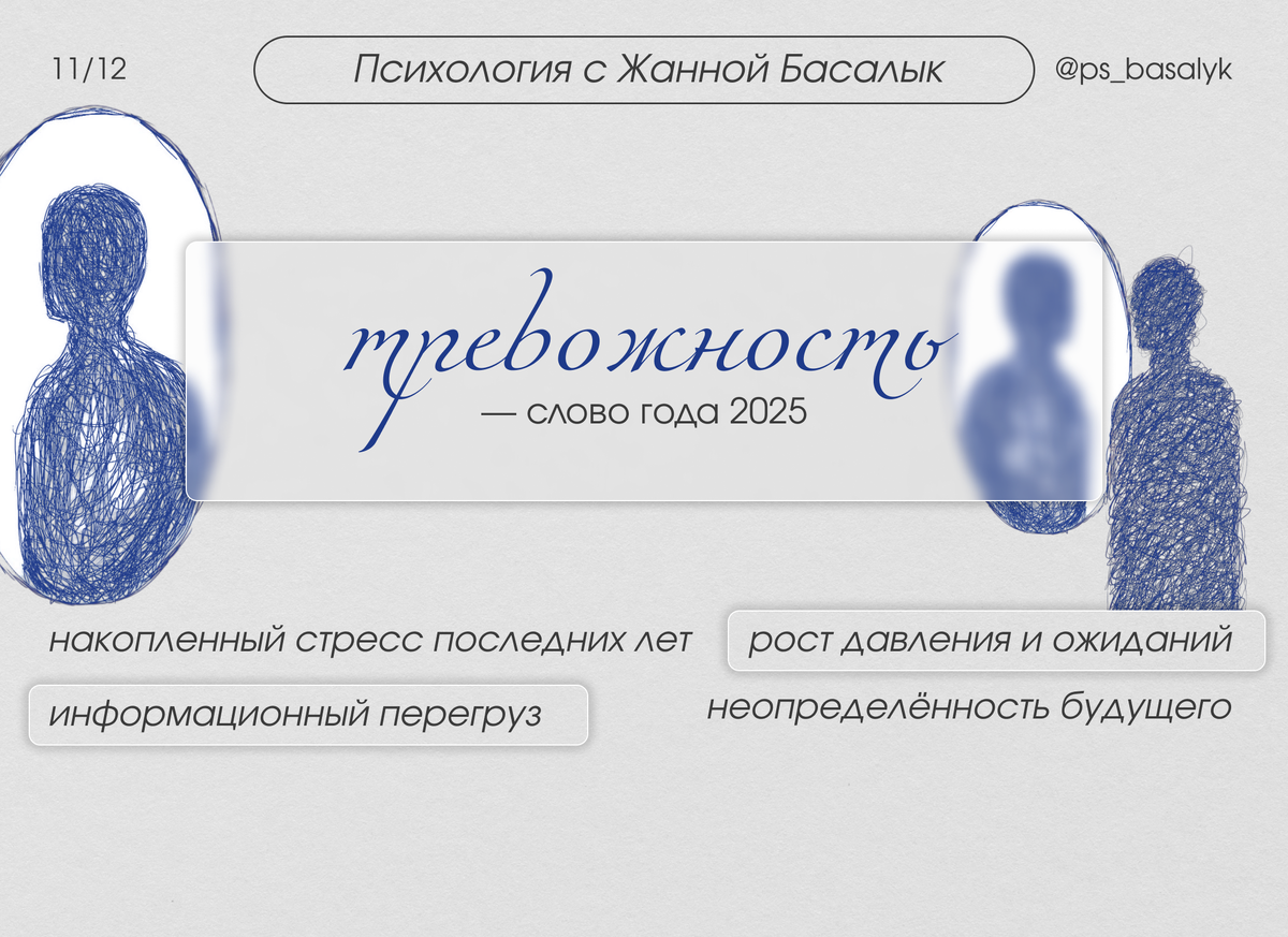 И это не просто модное слово. Это отражение того, что чувствует огромное количество людей прямо сейчас. Но почему именно тревожность стала главным символом года? Почему мы чаще всего просыпаемся с комом в груди, а мозг уже на старте перебирает все возможные катастрофы? Давайте разберёмся с точки зрения психологии и науки. 1. Тревожность — естественный механизм выживания С биологической точки зрения тревога — это сигнал безопасности. Она готовит тело к действию: ускоряет пульс, активирует мозг, повышает внимание. Но в современном мире «угрозы» поменяли форму: новости и соцсети, которые постоянно держат в напряжении нестабильность и страх потерь перегрузка информацией давление «успеть, быть, соответствовать» И теперь тревожность стала фоновым состоянием, которое сопровождает нас почти весь день. 2. Почему именно 2025 год? Накопленный стресс последних лет