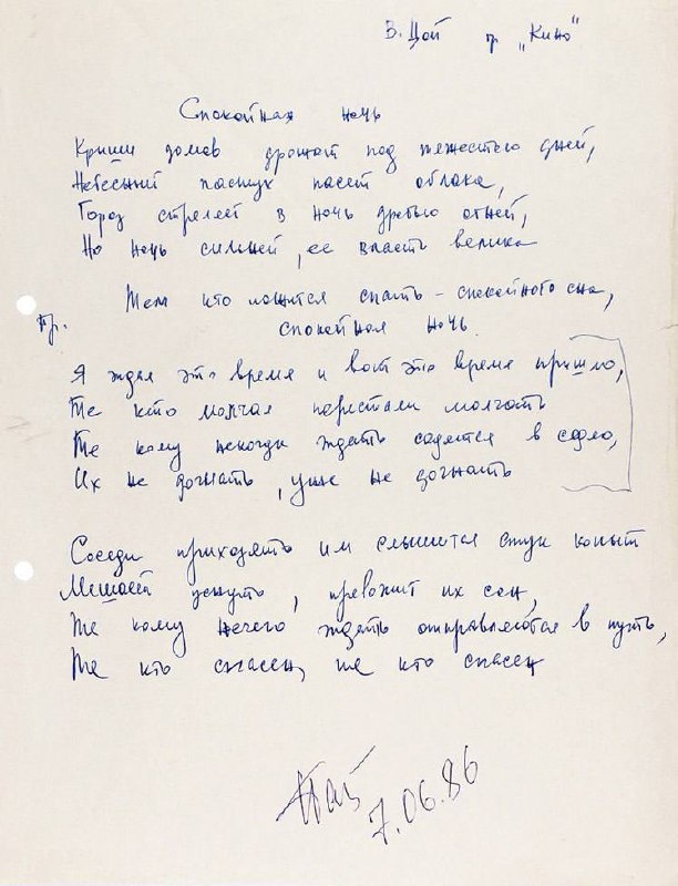 В Петербурге выставят на аукцион рукопись песни «Спокойной ночи» Виктора Цоя Текст песни написан собственноручно лидером группы «Кино». Стартовая цена лота составляет 1 миллион рублей. Торги запланированы на 18 декабря. На листке бумаги, помимо текста песни, имеется подпись Нины Барановской от 7 июня 1986 года. В тот день «Спокойная ночь» была впервые представлена на четвёртом фестивале Ленинградского Рок-клуба. Позже композиция вошла в альбом «Группа крови», вышедший в 1988 году. Нина Барановская работала в Рок-клубе с 1985 по 1990 годы, в должности методиста и заведующей репертуарного отдела. Именно она принимала решения о допуске песен к публичному исполнению. В июне 1986 года «Спокойная ночь» успешно прошла согласование и получила право быть исполненной. 📷: Аукционный дом «Литфонд» Читай нас в MAX! | Подпишись на Комсомольскую правду: СПб