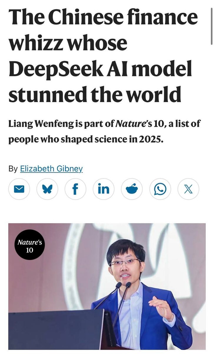 🐳 Основатель китайского стартапа DeepSeek Лян Вэньфэн вошел в десятку людей, изменивших науку в 2025 году по версии Nature