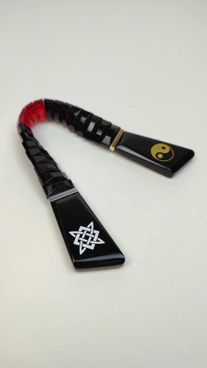 толщина ~ 8−8,5 мм. Добавлены 2 проставки: латунь и алюминий Гравировка нанесена на четыре поверхности из четырёх, содержит в себе четыре эскиза. Модель построена на контрасте и по цветам, и по символам. На одном конце — золотая гравировка хищного дракона, на другом — белый медведь. Два характера, две силы, два настроения. Они не сливаются, а стоят напротив. Основа глубокая чёрная, с плавным переходом к рубиновым звеньям по-центру. Рубин здесь как вспышка небольшой, но цепляющий акцент, который делает композицию живее. Подойдёт тем, кто любит чётки с характером, но без лишнего шума — спокойная эстетика с выразительными деталями.