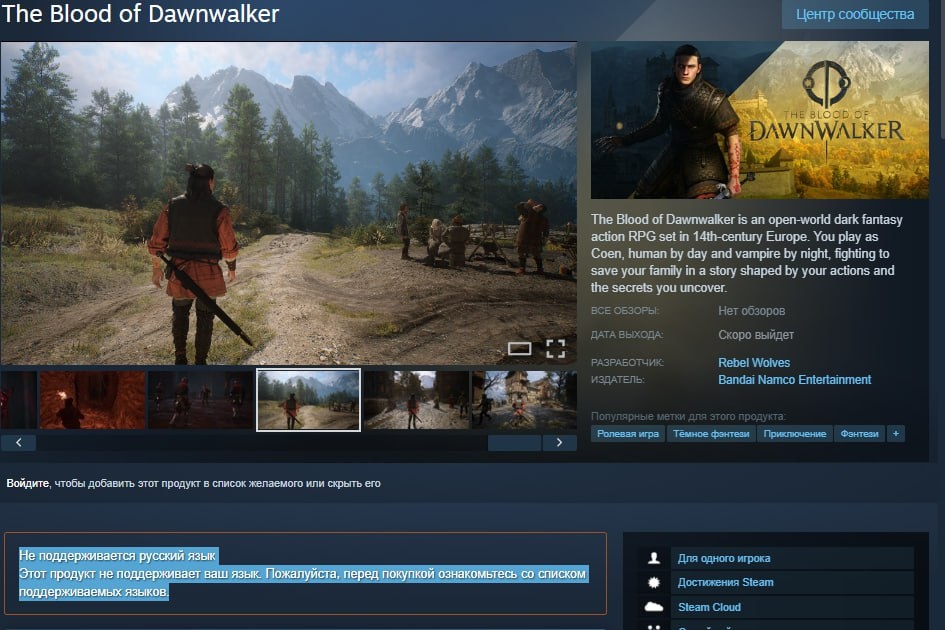 В ответ на пост GameMAG пишет, что «локализация текста в The Blood of Dawnwalker может появиться к релизу либо позднее». RPG от выходцев из CD Projekt RED выйдет в 2026 году на PS5, Xbox Series S|X и ПК. На момент написания поста русский язык на странице игры в Steam не указан. #игры@inyoueyes