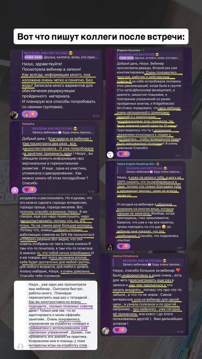 Всем привет! 💕 Рассказываю, как прошел вебинар «REVISION AND RECYCLING» - тот самый, о котором многие спрашивали. Зарегистрировались 32 человека, онлайн было около половины - для меня это честь, особенно видеть своих teacher-learners из разных групп. Они-то уж точно знают, как это - испытывать все приёмы на себе 😉 А знаете, как вообще родилась идея этого вебинара? Я уже выступала с этой темой на двух конференциях и показывала фрагменты в соцсетях. После одного из эфиров пришло сообщение: «А для подписчиков такой не планируете?» Спросила: «Надо?» Ответ: «Надо!» Ну, раз надо - значит, делаю! ✅ И вот что было на эфире: 1️⃣ Разобрали, чем revision отличается от recycling — это важно! 2️⃣ Увидели, на каких этапах урока и как их внедрять. 3️⃣ Показала, как из одного упражнения сделать несколько заданий на лексику и грамматику. 4️⃣ Поделилась идеями для интерактива и творческих заданий. 5️⃣ Обсудили, как передать этот процесс студентам. А ещё - были живые отзывы (смотрите прикрепленны
