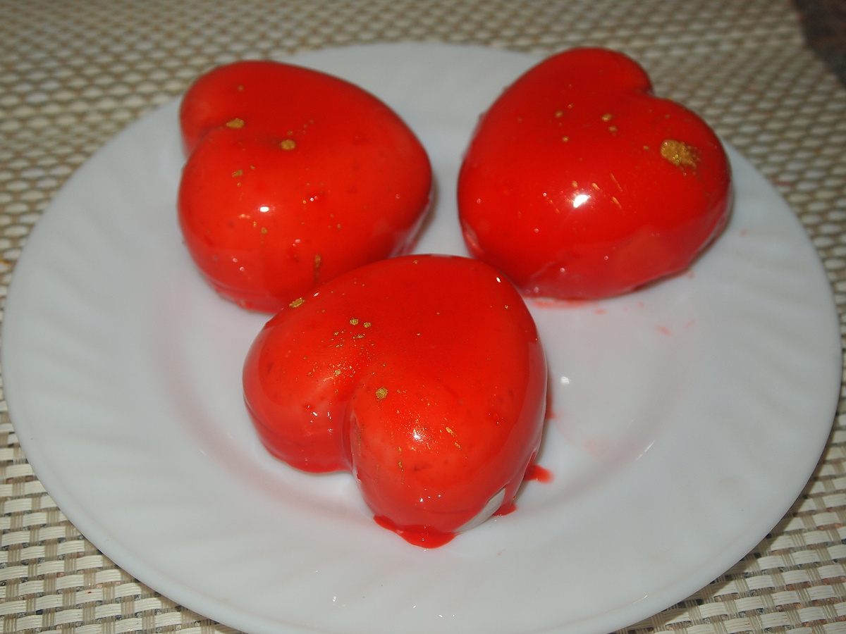 Для детского дня рождения или праздничного стола предлагаю приготовить муссовые пирожные с цветной глазурью. Для пирожных можно использовать любые формочки. Вес каждого пирожного в моих формочках приблизительно 100 г - это как раз порция для одного человека. Пирожное имеет аппетитный ярко-красный цвет, а внутри прячется нежный творожный мусс с начинкой из малинового желе. Для приготовления десерта в количестве 4 штук необходимо: - малиновый джем 100 г;