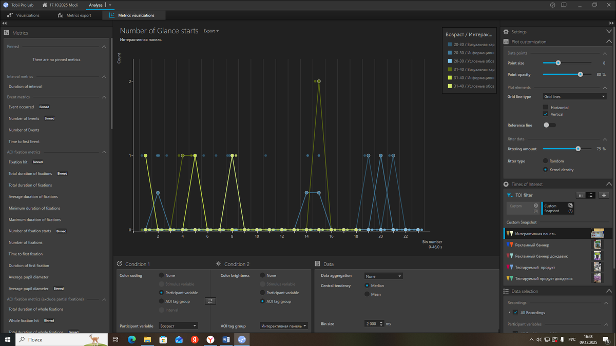 Представьте: взгляд покупателя — это пчела, а ваш товар — цветок. Фиксация — это момент, когда пчела садится на цветок. Не просто пролетает мимо, а садится. В нейромаркетинге это и есть момент истины. Метрики фиксации — это расшифровка «точек интереса» мозга потребителя. 1. Fixation Count (Количество фиксаций) — «Сколько раз вас заметили?» Что измеряет: Сколько раз взгляд останавливался на объекте. Простая аналогия: Сколько раз вы перечитываете важное сообщение. Интерпретация: