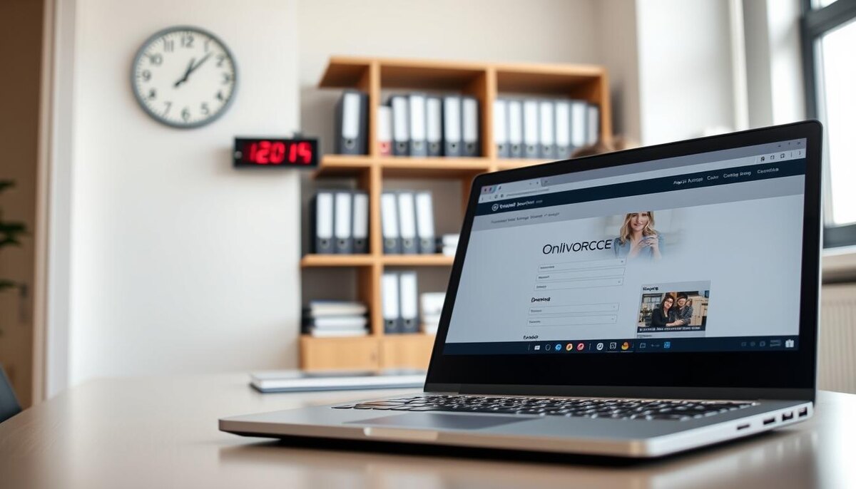 A modern, professional scene depicting an online divorce application process. In the foreground, a laptop is open displaying the user-friendly interface of a government services website, showcasing a divorce application form. A business professional, dressed in smart casual attire, is engaged in the application process, with a focused expression. In the middle ground, a cozy home office is visible, featuring a well-organized desk with legal documents, a tablet, and a plant for a touch of warmth. The background shows a soft-focus bookshelf filled with law books, lending an air of authority. Natural light streams through a window, creating an inviting and serene atmosphere, symbolizing a new beginning. The composition emphasizes clarity, professionalism, and accessibility in the divorce process.