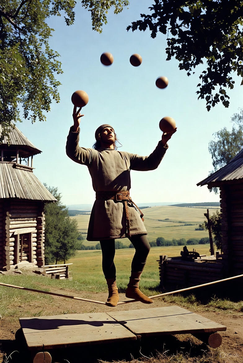 И автор «Слова» его откровенно высмеивает. Доказательства — прямой текст: «Рыща в тропу Трояню чрез поля на горы». Это не поэзия — это насмешка. «Тропа Трояня» — жонглёрская сказка про Трою, которую скоморохи разыгрывали на ярмарках. Боян «рыщет» — то есть прыгает по канату, жонглирует, показывает фокусы. «Чрез поля на горы» — ходит по канату, натянутому между двумя шестами. Современники понимали: «песни через пень-колоду». «Пети было песнь Игореви, того внуку». В рукописи после «того» стояла глосса «Ольг» — «Игореви того Ольг(овича)». То есть Боян пел песни именно Игоря Ольговича, автора «Трудных повестей». А не Игоря Святославича 1185 года. В конце «Слова»: «Рек Боян и Ходына, Святославли песн