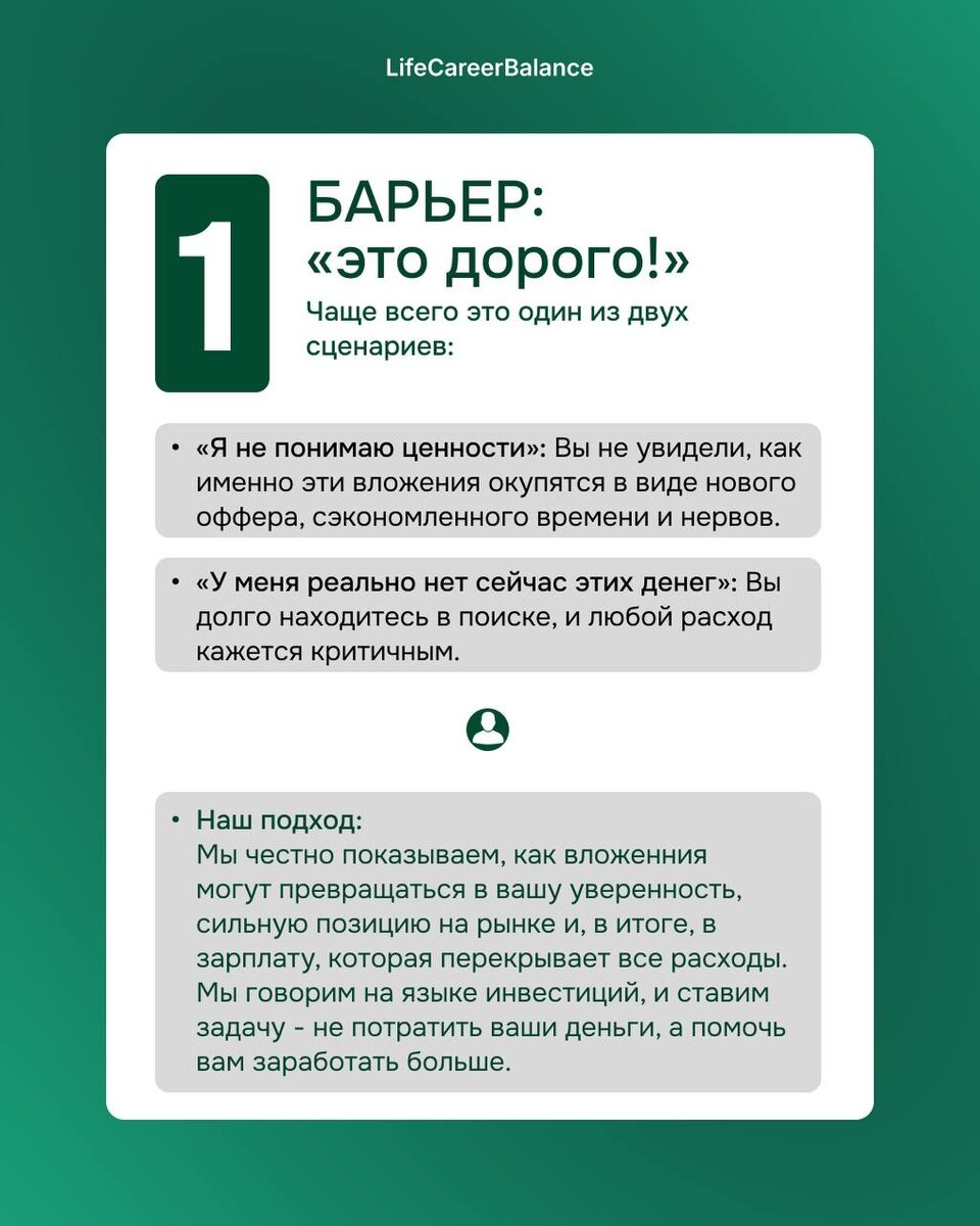 Давайте начистоту? Вы приходите на карьерную диагностику, полные решимости изменить свою жизнь🚀 Мы обсуждаем ваши цели, видим путь к прорыву... а потом запал вдруг пропадает. В голове крутятся мысли-сомнения, которые становятся невидимой стеной между нами. Мы решили подсветить их сейчас, чтобы вы узнали их «в лицо» и сделали шаг на встречу к своим целям. Итак, барьеры на пути в офферу: 1. «Дорого» или «Нет финансовой возможности». Классика. Но давайте посмотрим на это как на инвестицию, а не как на расход. Мысль «а стоит ли оно того?» абсолютно резонна. Так бросьте нам вызов! Спросите прямо: «Как именно эта инвестиция окупится?». Попросите наши кейсы. Убедитесь сами, что работа с нами - это карьерный лифт👌 2. «Я подумаю...». Вежливый убийца возможностей. За этим почти всегда прячется что-то более конкретное. Но пока вы «думаете», лучшие вакансии уходят к другим. А ставить на «стоп» карьеру нельзя. Давайте ловить это сомнение за хвост СЕЙЧАС и разбираться, что на самом деле вас